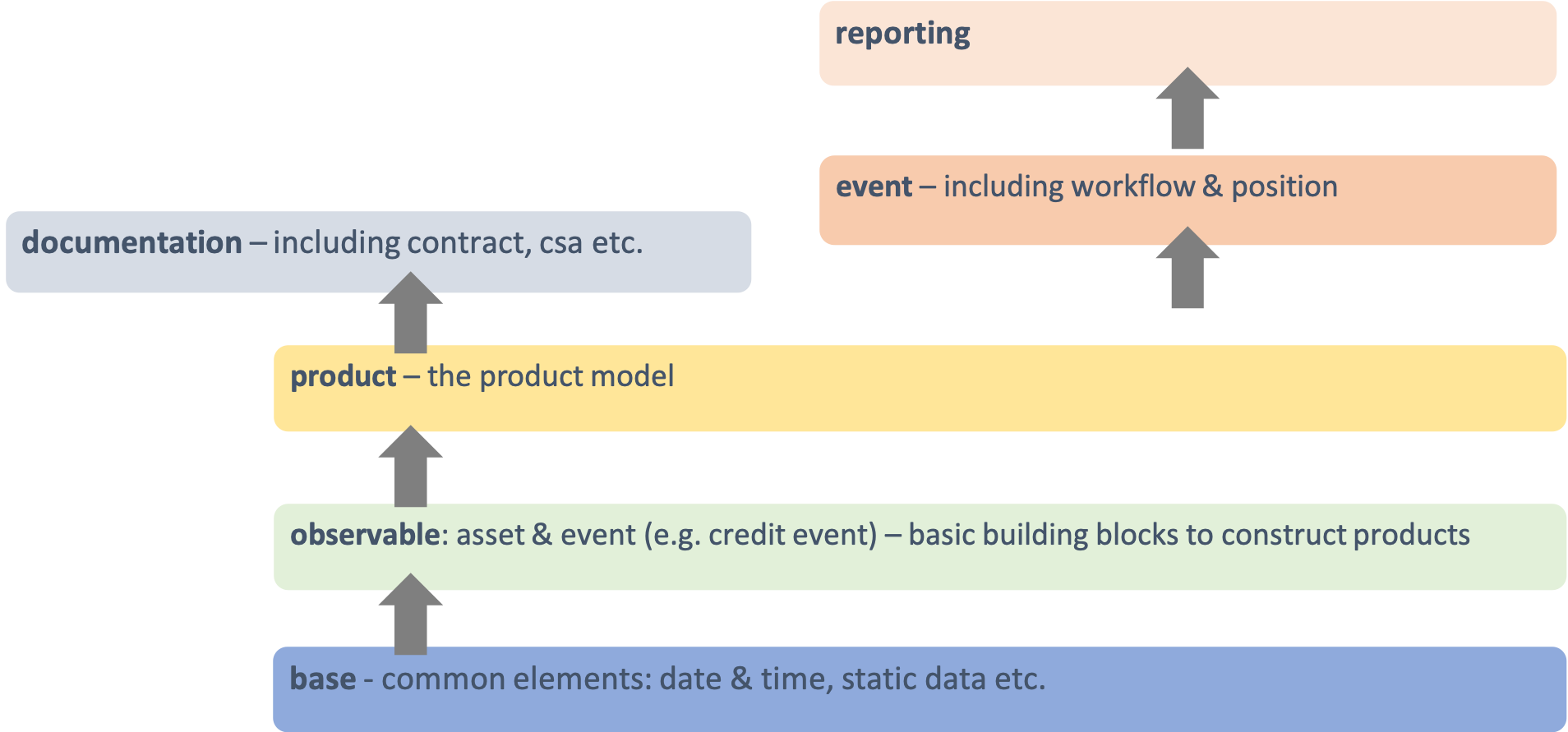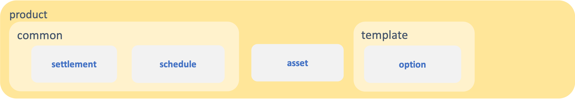 - Financial products: e.g. the same option component is re-used to describe option payouts across any asset class, rather than having specialised Swaption, Equity Option or FX option etc. components.